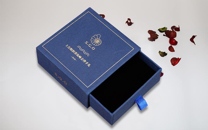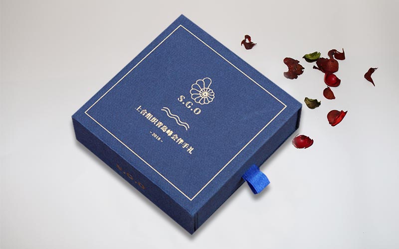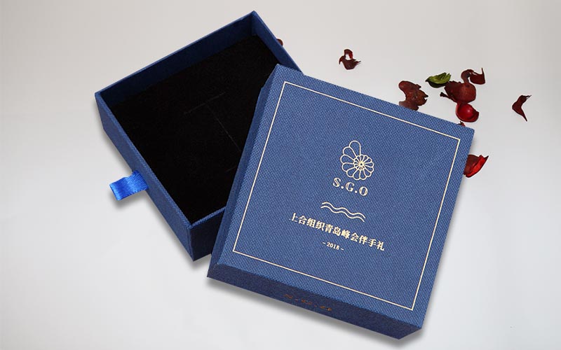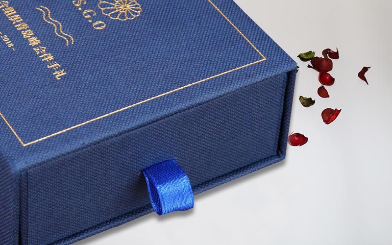 1.材質:盒子面紙採用小石頭紋的藍色特種紙,盒子表面文字LOGO燙金色,裱1200G單白闆,整體盒子爲抽屜盒性 ,抽拉的地方裝藍色的絲帶。整款盒子手工制作。