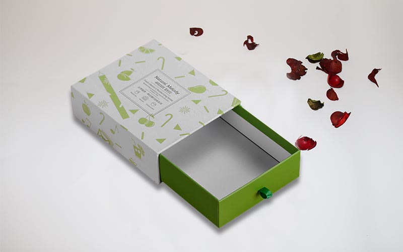 1.材質:盒子採用157G銅版紙彩色印刷單面啞膜,小圖片UV光油,裱1200G單白闆,盒子整體爲淺綠色,抽屜盒型粘綠色絲帶盒子,裏面内托爲白色A級材質無味道。